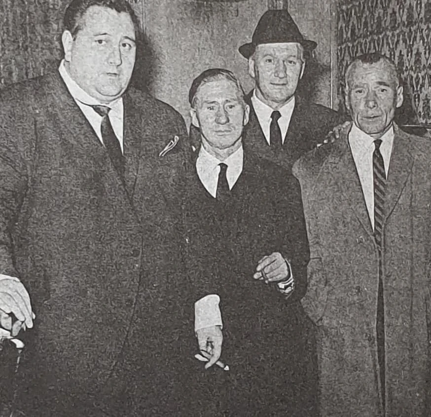 Charlie Kray (furthest right) with his brother Billy Kray (centre), next to Big Pat Connolly, in the 20th Century Club, Brick Lane.