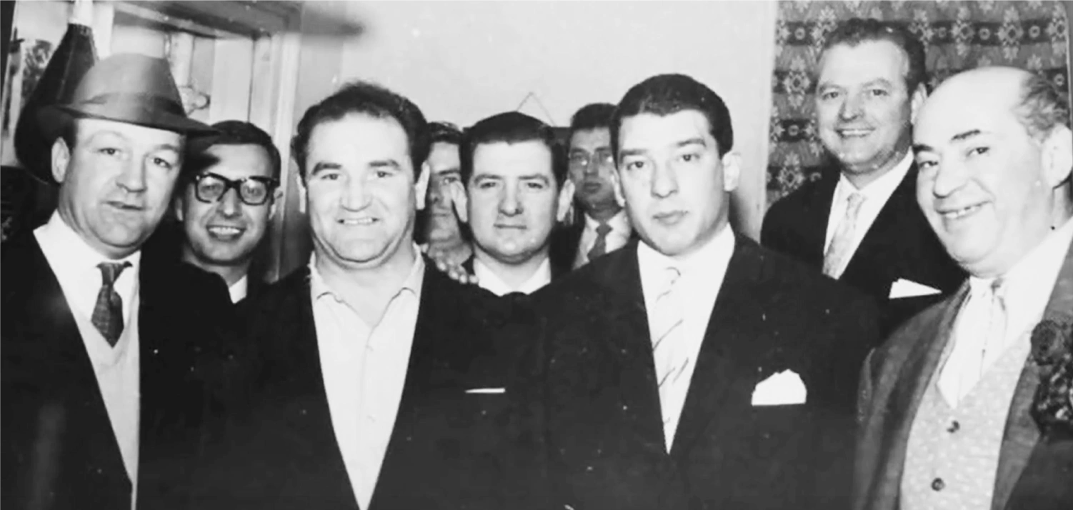 Driberg (far right) with Buller Ward (far left), Bert Rossi (centre), Ronnie Kray (third from right) and other Kray associates.